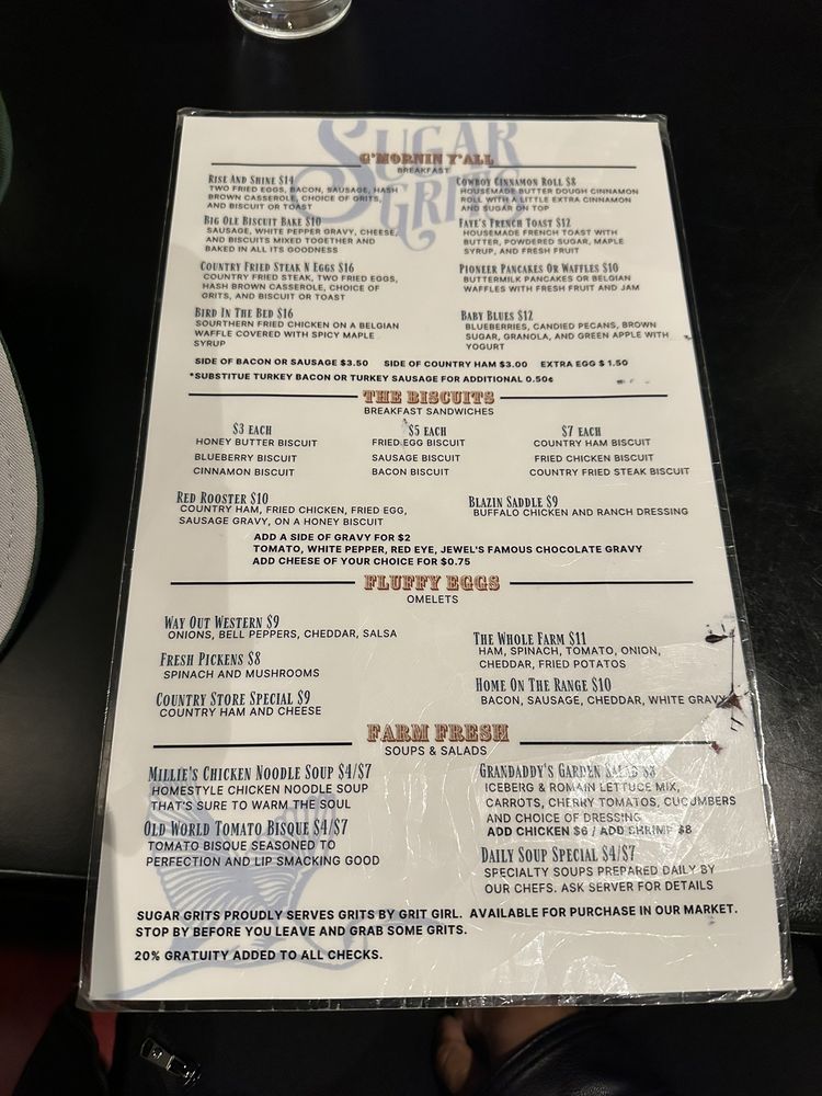 Located in Memphis, TN, Sugar Grits offers a casual and trendy dining experience with a focus on flavorful Southern cuisine. The menu features signature dishes like the G'Mornin Y'all with blueberries and granola, the Big Ole Biscuit Bake, and the Bird in the Bed with fried chicken on a Belgian waffle. Their selection of biscuits, including the Bacon Biscuit and Fried Chicken Biscuit, is a must-try. For egg lovers, the Fluffy Eggs options like Country Store Special and Fresh Pickens are popular choices. Customers rave about the creamy grits and generous toppings, though some note occasional wait times due to staffing issues. Overall, Sugar Grits promises a delicious breakfast or brunch experience with a cozy atmosphere and attentive service.